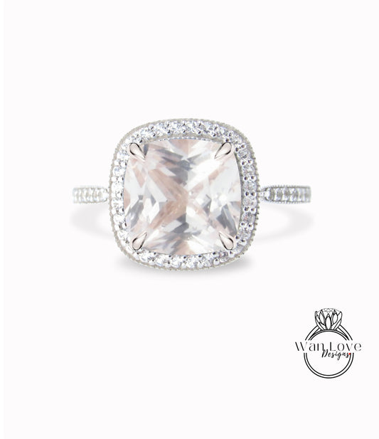Cushion Cut Light Pink Sapphire Engagement Ring,Diamond/Moissanite Halo Wedding Ring,Half Eternity Diamond Milgrain Custom Ring,14k/18k Gold