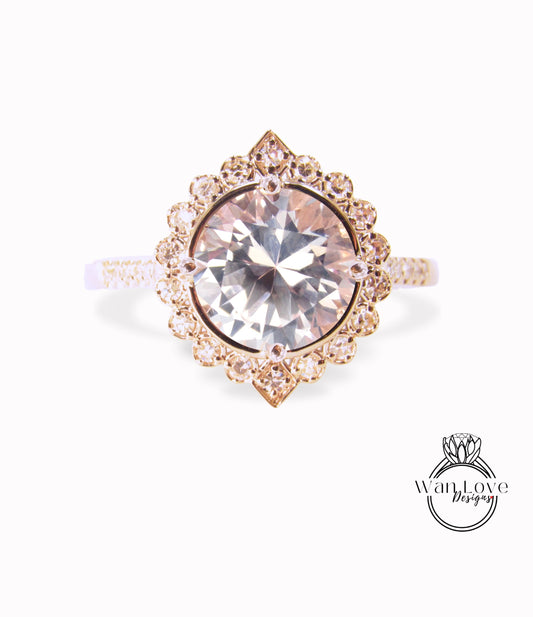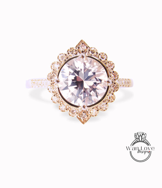 Peach Sapphire & Diamonds Geometric Halo Round Engagement Ring, Custom,14k 18k White Yellow Rose Gold-Platinum-Wedding,Anniversary Gift