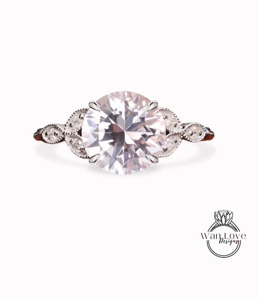 Light Pink Sapphire & Diamonds Round Leaf Antique Cluster Engagement Ring Engraved Milgrain or Smooth 14kt 18kt Gold Platinum Custom Wedding