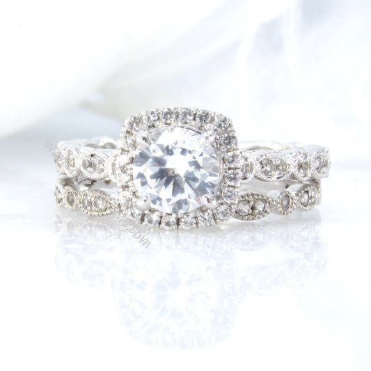 vintage White Sapphire Diamond Cushion Halo Engagement Ring set 1ct antique Milgrain Round Leaf Wedding Band Set promise anniversary set