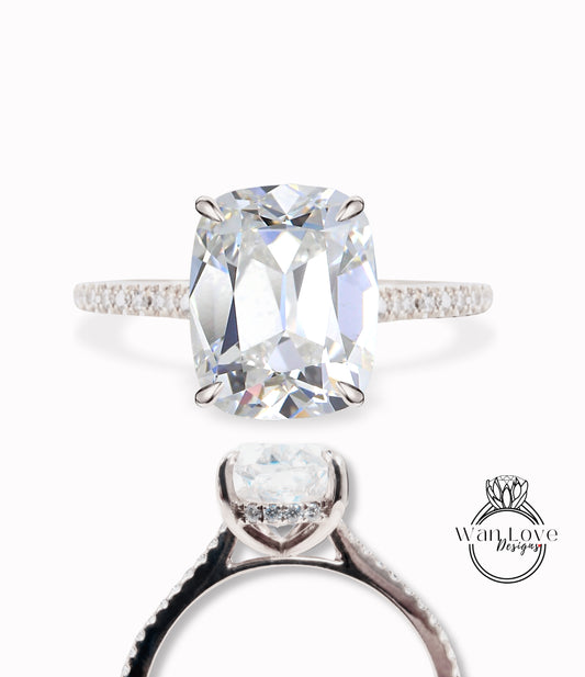 OMC Moissanite & Diamond Elongated Cushion Side Halo Half Eternity Engagement Ring rose gold Ring Art Deco Old Mine cut Wedding Bridal Ring Anniversary Gift