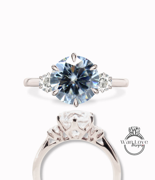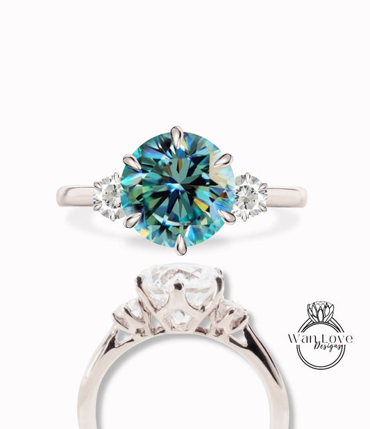 Blue Green moissanite & Diamond 3 gem Stone Engagement Ring 6 prong trellis Round three gemstone ring 14k 18k White Yellow Rose Gold Platinum-Custom-Wedding Anniversary Gift