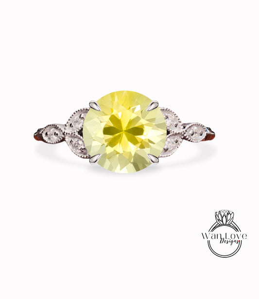 Yellow Sapphire & Diamonds Round Leaf Antique Cluster Engagement Ring Engraved Milgrain or Smooth 14kt 18kt Gold Platinum Custom Wedding