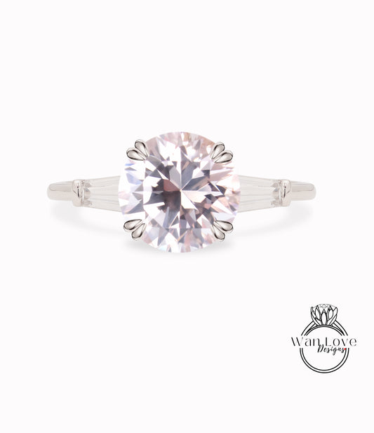 Light Pink Sapphire & Diamond Round Tapered Baguette 3 gem Engagement Ring, Custom Moissanite lab diamond 14k 18k White Yellow Rose Gold Platinum Wedding bridal ring, Anniversary gift