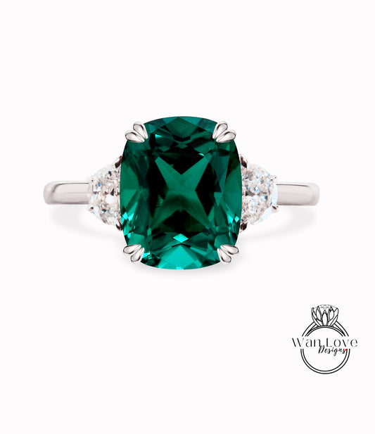 Emerald & diamond half moon elongated cushion 3 gemstone engagement ring plain band Moissanite diamond rose gold art deco diamond three gem stone ring wedding Bridal Anniversary gift