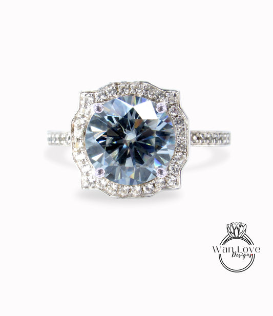 Gray Moissanite & Diamond Antique Bezel Frame Engagement Ring Art Deco Geometric Halo Vintage Round 14k 18k White Yellow Rose Gold Bridal Proposal Wedding ring Anniversary Gift