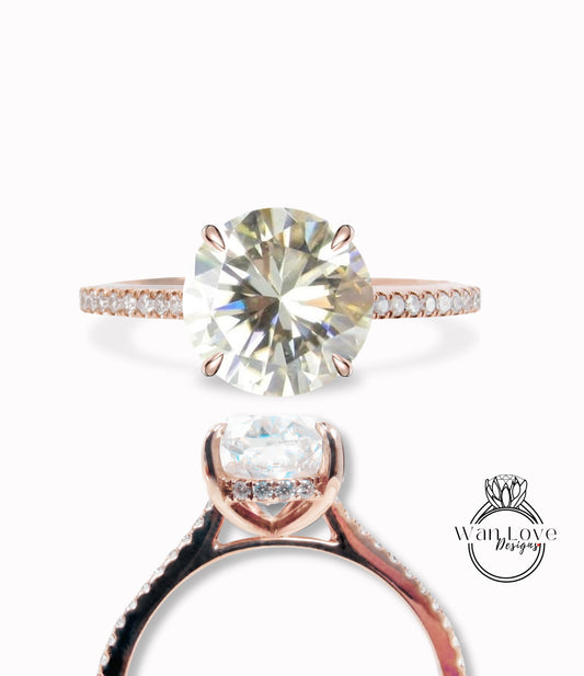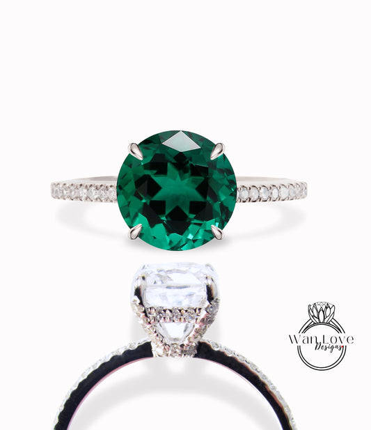 Emerald & Diamond prongs Basket Round Engagement Ring, Side Halo, 3/4 Almost Eternity, Custom Bridal Wedding Ring, 14kt 18kt Gold, Platinum, Anniversary Gift