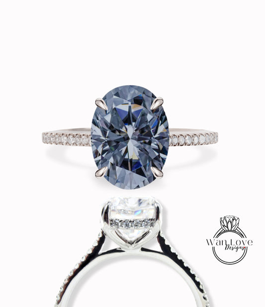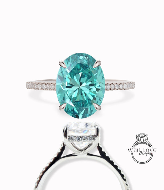 Blue Moissanite & Diamond Oval Side Halo 3/4 Almost eternity Engagement Ring, Pave Rim wedding bridal ring 14kt 18kt Solid Gold Anniversary Gift