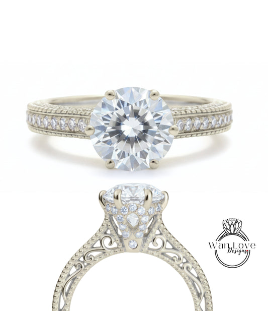 White Sapphire & Diamonds Round Beaded Milgrain Engagement Ring unique vintage filigree Rose Gold Anniversary Gift antique wedding bridal ring