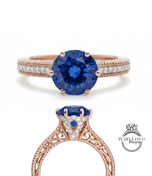 Blue Sapphire & Diamonds Round Beaded Milgrain Engagement Ring unique vintage filigree Rose Gold Anniversary Gift antique wedding bridal ring
