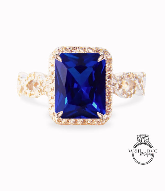 Blue Sapphire & Diamond Emerald cut Halo Twisted Engagement Ring Split Shank Infinity Twist Vine ring Bridal wedding ring Anniversary Gift