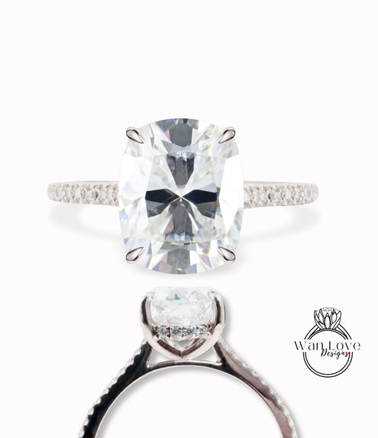 Moissanite & Diamond Elongated Cushion Side Halo 3/4 Almost Eternity Engagement Ring rose gold Ring Art Deco Long Cushion Wedding Bridal Ring Anniversary Gift