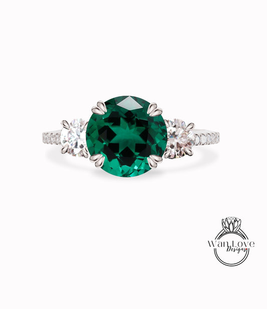 Emerald & Diamond 3 gemstone engagement Ring Diamond Round Three gem Stone bridal wedding Ring Anniversary Gift