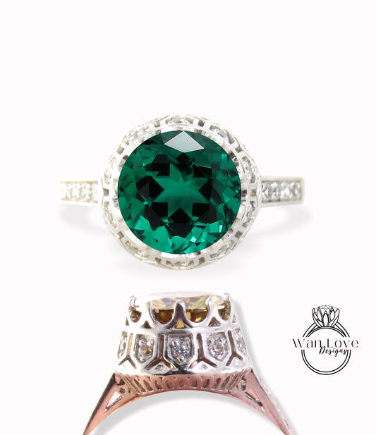 Emerald & Diamonds Antique Vintage Style Crown Royalty Filigree Engagement Ring 2ct 8mm Custom Wedding Anniversary Gift