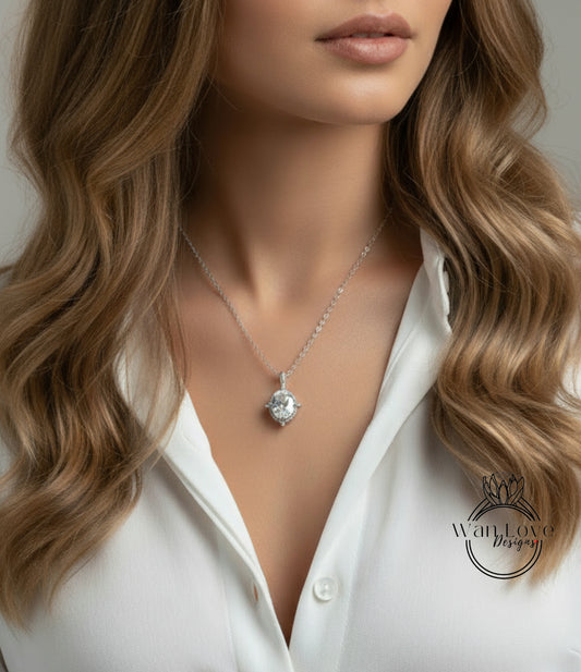 Oval Moissanite Necklace, Oval Diamond Halo Pendant, East West or Vertical charm, Birthstone Choice Womens Necklace, Special Gift For Her.