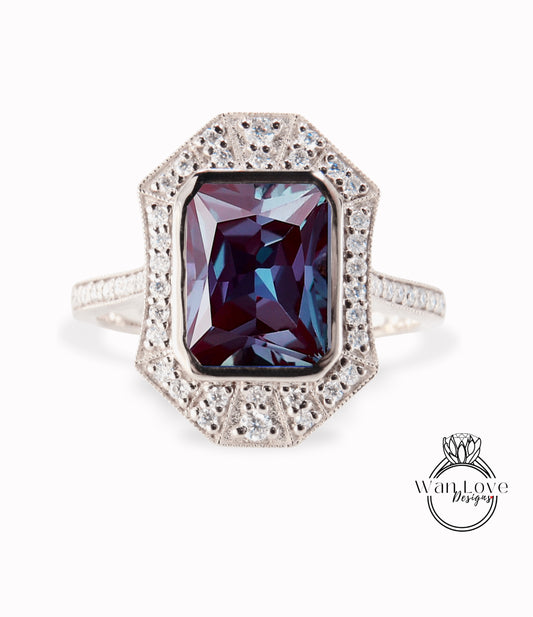 Art Deco Alexandrite & Diamond Emerald cut Ring, Milgrain Bezel Halo Ring, Alexandrite Moissanite Ring, Vintage Inspired Ring