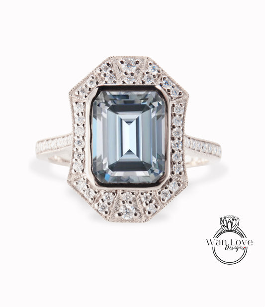 Art Deco Gray Moissanite & Diamond Ring, Vintage milgrain Bezel Emerald cut Halo Ring, Art Deco Wedding Bridal Ring Anniversary Promise Ring