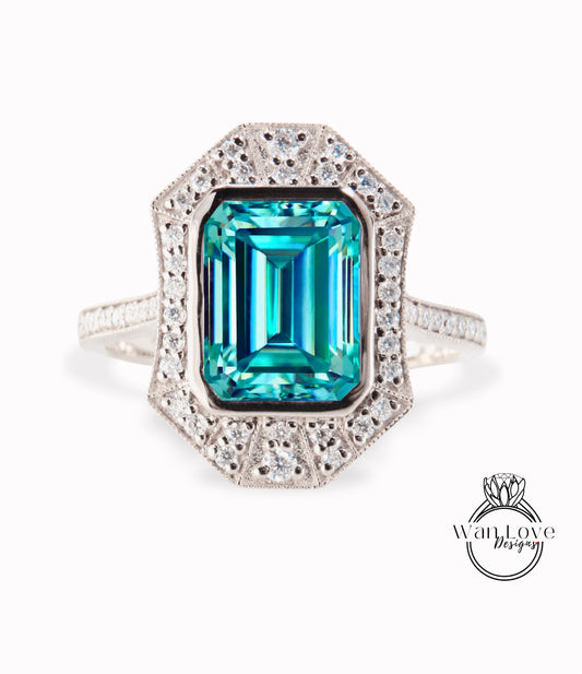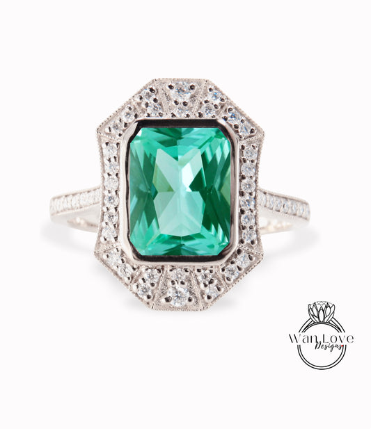 Art Deco Halo Emerald & Diamond Ring, Milgrain Bezel Halo Ring, Emerald Moissanite Ring, Vintage Inspired Ring