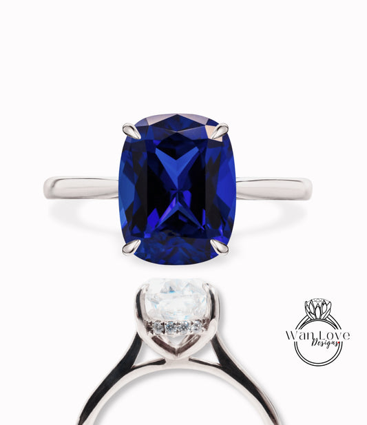 Blue Sapphire & Diamond Elongated Cushion Engagement Ring, Side Halo Ring, Long Cushion cut ring, Plain tapered band shank ring, Custom, Bridal Wedding ring Anniversary Gift