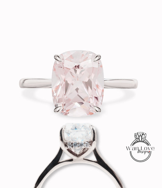 Light Pink Sapphire & Diamond Elongated Cushion Engagement Ring, Side Halo Ring, Long Cushion cut ring, Plain tapered band shank ring, Custom, Bridal Wedding ring Anniversary Gift
