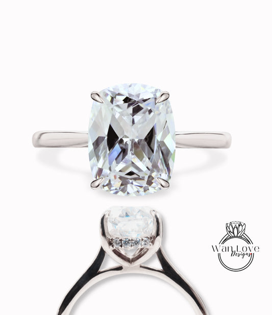 White Sapphire & Diamond Elongated Cushion Engagement Ring, Side Halo Ring, Long Cushion cut ring, Plain tapered band shank ring, Custom, Bridal Wedding ring Anniversary Gift