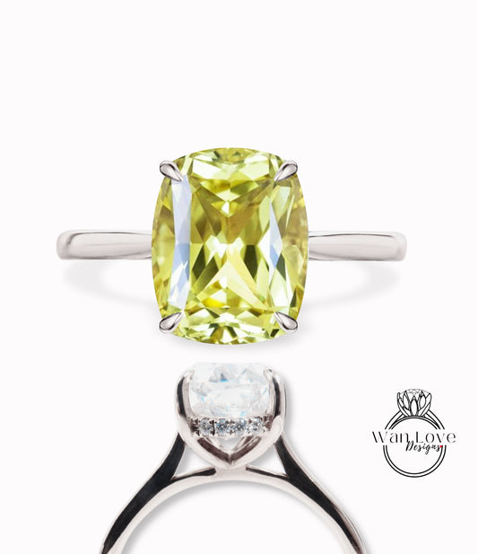 Yellow Sapphire & Diamond Elongated Cushion Engagement Ring, Side Halo Ring, Long Cushion cut ring, Plain tapered band shank ring, Custom, Bridal Wedding ring Anniversary Gift