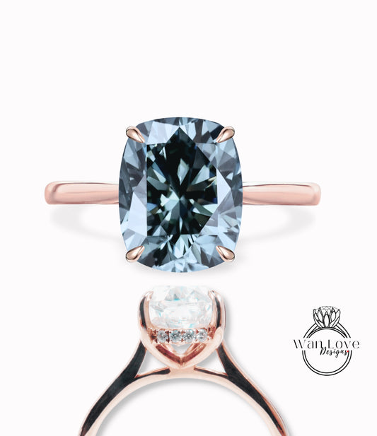 Gray Moissanite & Diamond Elongated Cushion Engagement Ring, Side Halo Ring, Long Cushion cut ring, Plain tapered band shank ring, Custom, Bridal Wedding ring Anniversary Gift