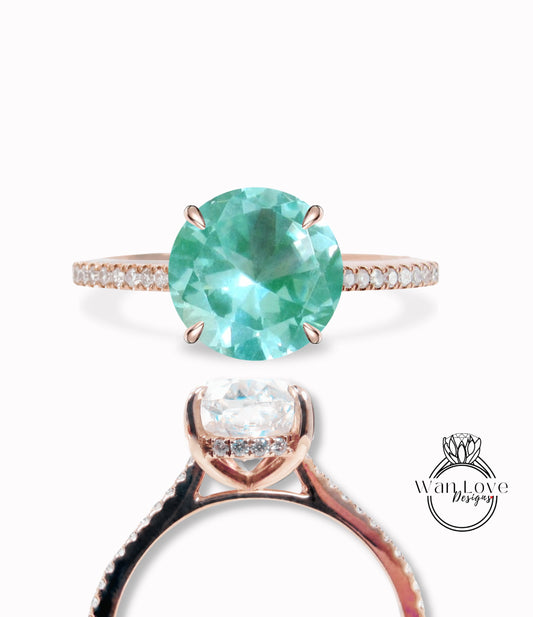 Teal Spinel & Diamond Side Halo Half Eternity Engagement Ring rose gold round ring art deco diamond halo ring wedding Bridal ring Anniversary Gift