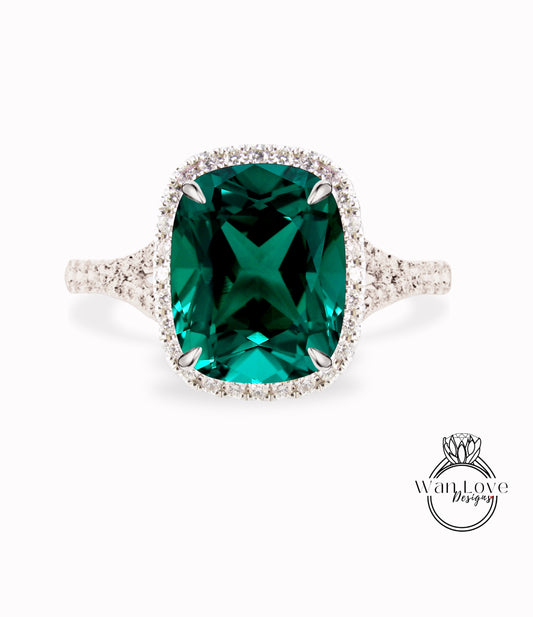 Emerald & Diamond Elongated Cushion Halo Split Shank Ring Engagement Ring Art Deco split band Halo Ring Wedding bridal ring Anniversary gift