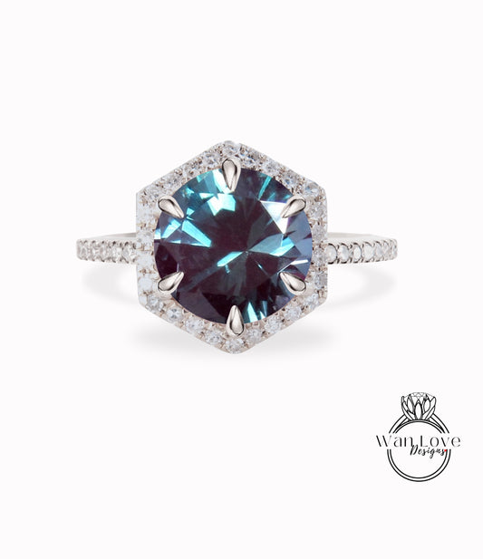 Hexagon Halo Alexandrite engagement ring Round cut diamond halo ring half eternity vintage art deco rose gold ring anniversary promise ring