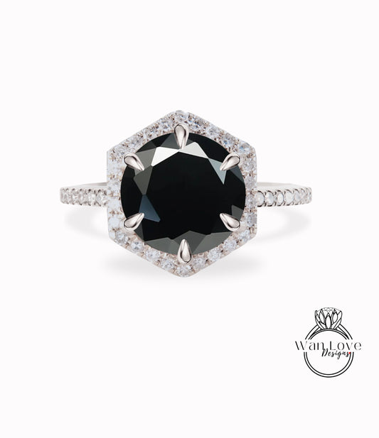 Diamond Hexagon Halo Ring Black Moissanite Diamond Round cut Engagement Ring Art Deco rose gold vintage Halo Ring wedding bridal promise