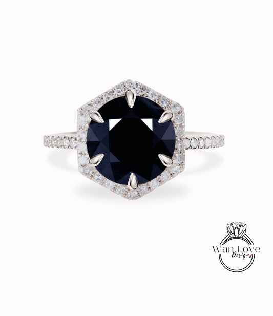 Natural Dark Blue Sapphire & Diamond Hexagon Halo Round Engagement Ring, 1.5ct 7mm, 14k 18k White Yellow Rose Gold-Platinum-Custom-Wedding