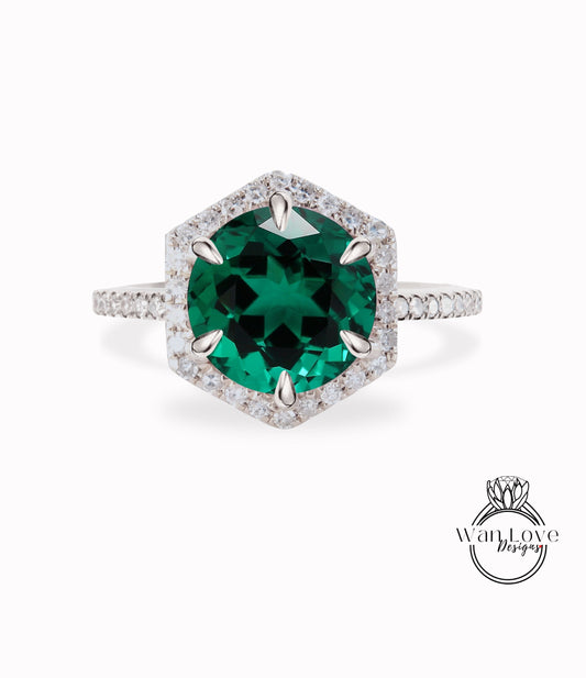 Hexagon Halo Emerald engagement ring Round cut diamond halo ring half eternity vintage art deco rose gold ring anniversary promise ring