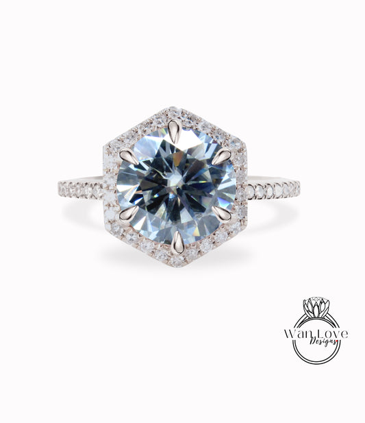 Grey Moissanite Hexagon Diamond Halo Gold Ring/ Round Gray Moissanite Center gem Ring/ Engagement Ring/ Anniversary Ring/ Promise Ring/ Halo Milgrain Ring