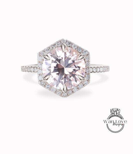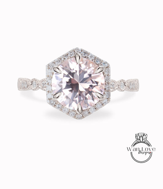 Light Pink Sapphire & Diamond Hexagon Halo Round cut diamond halo engagement ring half eternity vintage art deco rose gold bridal wedding ring anniversary gift