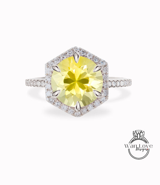 Yellow Sapphire & Diamond Hexagon Halo Round cut diamond halo engagement ring half eternity vintage art deco rose gold bridal wedding ring anniversary gift