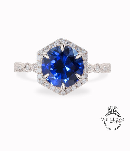Blue Sapphire & Diamond Hexagon Halo Scalloped Engagement Ring, Round cut Ring, Milgrain Vintage leaf wedding Bridal Ring, Anniversary Gift