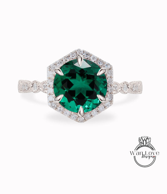 Emerald & Diamond Hexagon Halo Scalloped Engagement Ring, Round cut Ring, Milgrain Vintage leaf wedding Bridal Ring, Anniversary Gift