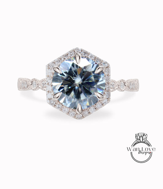 Moissanite & Diamond Hexagon Halo Scalloped Engagement Ring, Round cut Ring, Milgrain Vintage leaf wedding Bridal Ring, Anniversary Gift
