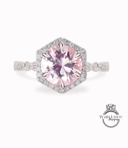 Light Pink Sapphire & Diamond Hexagon Halo Scalloped Engagement Ring, Round cut Ring, Milgrain Vintage leaf wedding Bridal Ring, Anniversary Gift