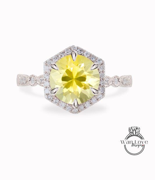 Yellow Sapphire & Diamond Hexagon Halo Scalloped Engagement Ring, Round cut Ring, Milgrain Vintage leaf wedding Bridal Ring, Anniversary Gift