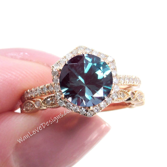 Vintage Alexandrite Engagement Ring Rose gold Women Diamond Hexagon Halo wedding set Vintage Bridal set Promise ring Anniversary ring
