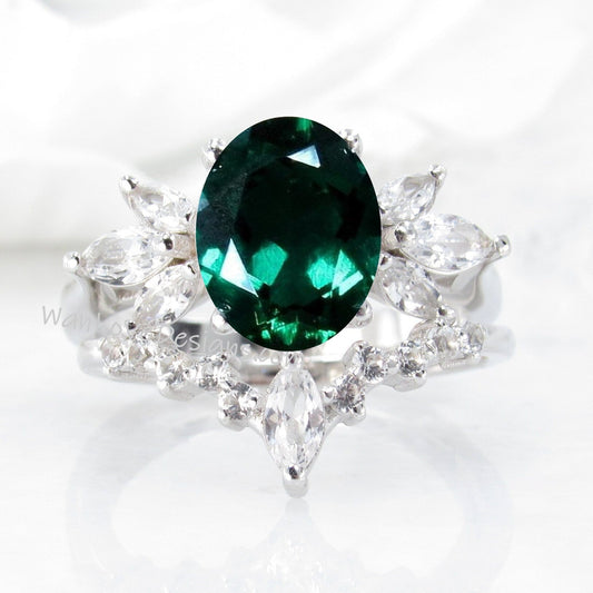 2PCS Emerald engagement ring white gold Pear shaped Unique Cluster vintage ring vintage Marquise curved wedding band Promise gift