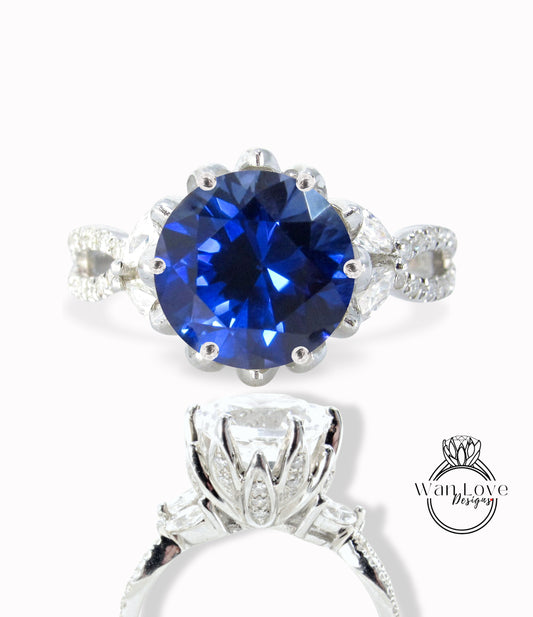Blue Sapphire & Diamond Lotus Flower Engagement Ring Marquise Split Shank Round 14k 18k White Yellow Rose Gold-Platinum-Custom-Wedding