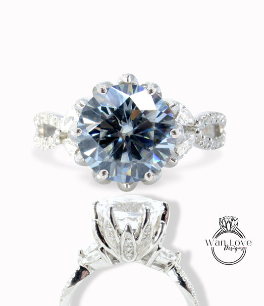 Vintage Grey Moissanite Diamond Lotus Flower Ring Marquise Leaf Split Shank round Engagement Ring antique flower ring wedding bridal ring