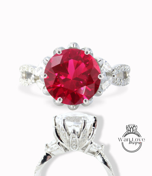 Ruby & Diamond Ring-Lotus Flower Engagement Ring-Marquise Gems-Split Shank Leaf Ring Custom-Weding-Anniversary Gift-Push Gift