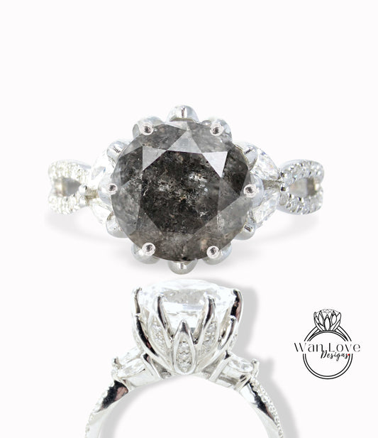 Salt & Pepper Diamond Lotus Flower Engagement Ring Marquise Split Shank Leaf 14k 18k White Yellow Rose Gold-Platinum-Custom-Wedding