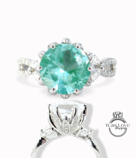 Teal Spinel Ring, Oval Floral Spinel Ring, Side Moissanite Ring, Mint Spinel Engagement Ring, Marquise Moissanite Ring