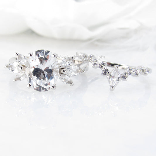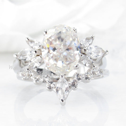 White Sapphire Engagement Ring Set, White Sapphire Moissanite ring set with side marquise Moissanite
