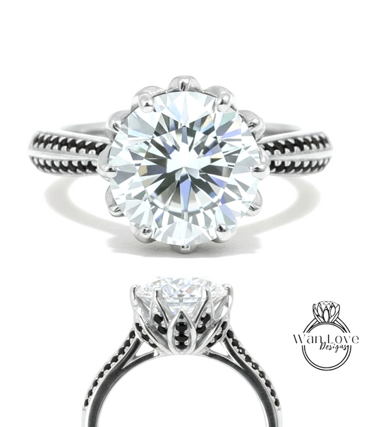 Black & White Moissanite Diamond Lotus Flower Engagement Ring vintage round woman nature petals ring Unique Bridal ring Anniversary gift